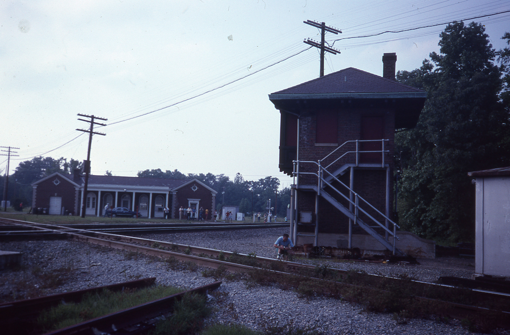 This photo shows HN cabin with the C&O / RF&P crossing in the foreground. It was taken at the same time as the June 1989 photo of the depot above. (Photographer unknown. From a slide in the collection of Larry Z. Daily.)