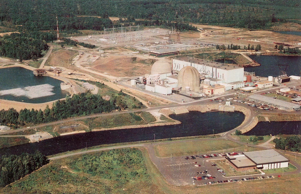 This image of the North Anna plant is from an undated postcard. On the back it dates Unit 1 to June of 1978 and Unit 2 to December 1980. The pressurized water reactors were built by Westinghouse and used uranium dioxide for fuel. The net capacity of the plant was 1,786 megawatts. (From a postcard in the collection of Larry Z. Daily)