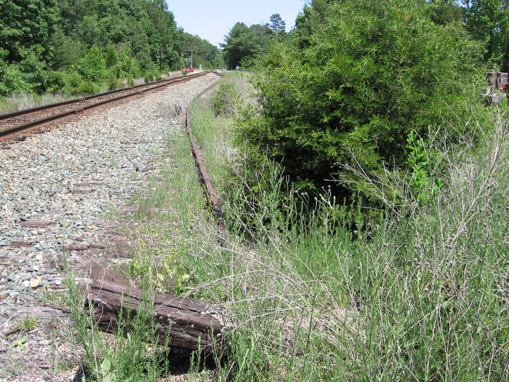 This is where the tracks end. The wheel stops are a pair of crossed ties. The entire length of the siding is visible in this photo. (June 2, 2008 photo by Larry Z. Daily)