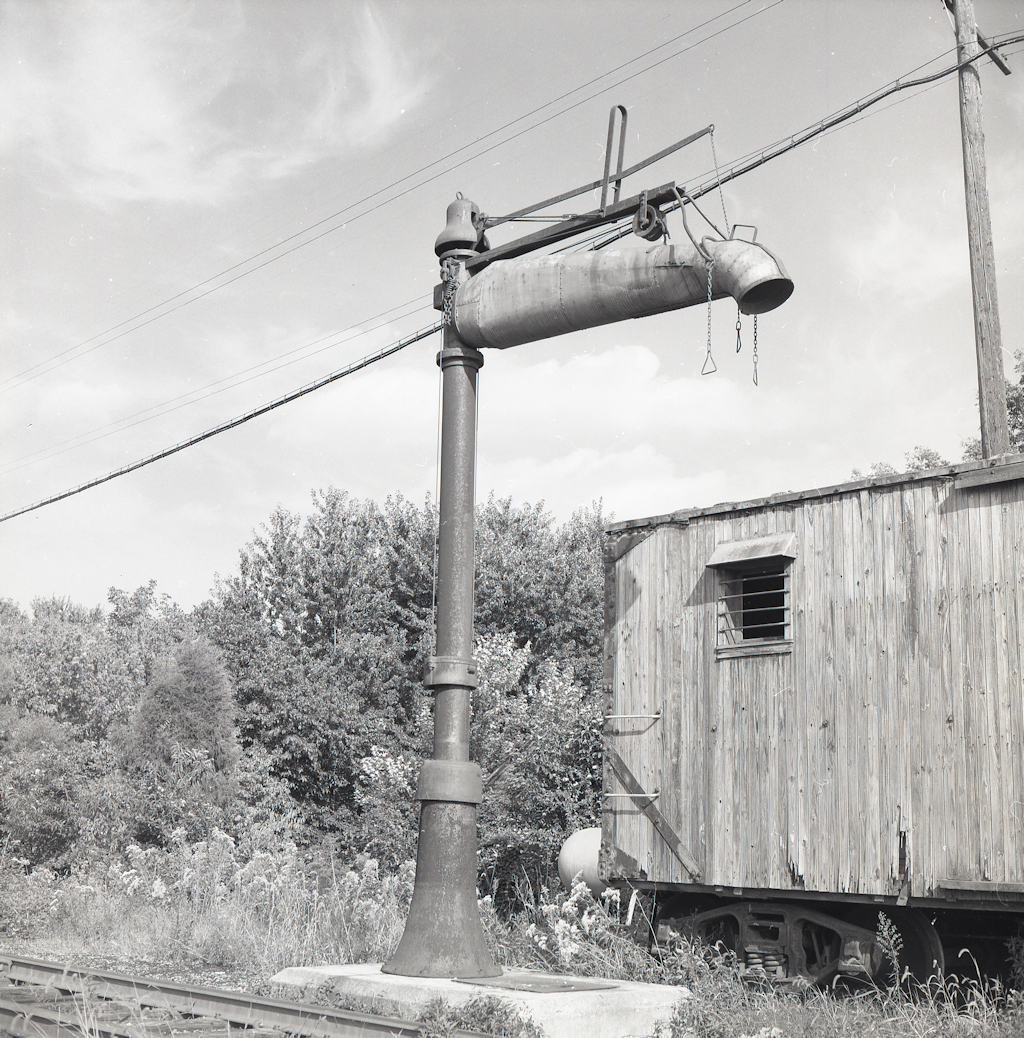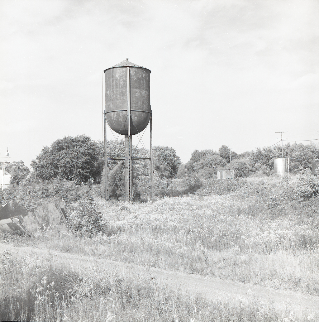 As noted above, the steel water tank existed in the 1950’s. The wooden tank was to the left. Note the mill in the background; it seems to have wood siding. By the time that I was taking photos in the 1990’s it was covered in metal siding. (Photo by Doug C. Jones. From a negative in the collection of Larry Z. Daily.)