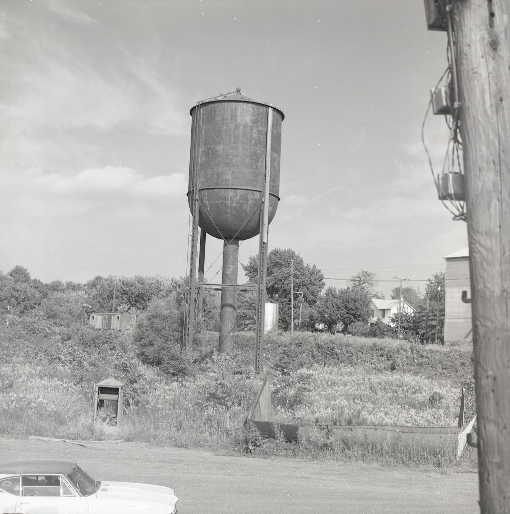 [NEW] This photo of the steel water tank was taken on September 15, 1974. Note the MOW boxcar in the background. Also visible is the train order semaphore on the Washington Sub leg of the wye and some kind of vertical tank near the mill building. (Photographer unknown. From a negative in the collection of Larry Z. Daily)