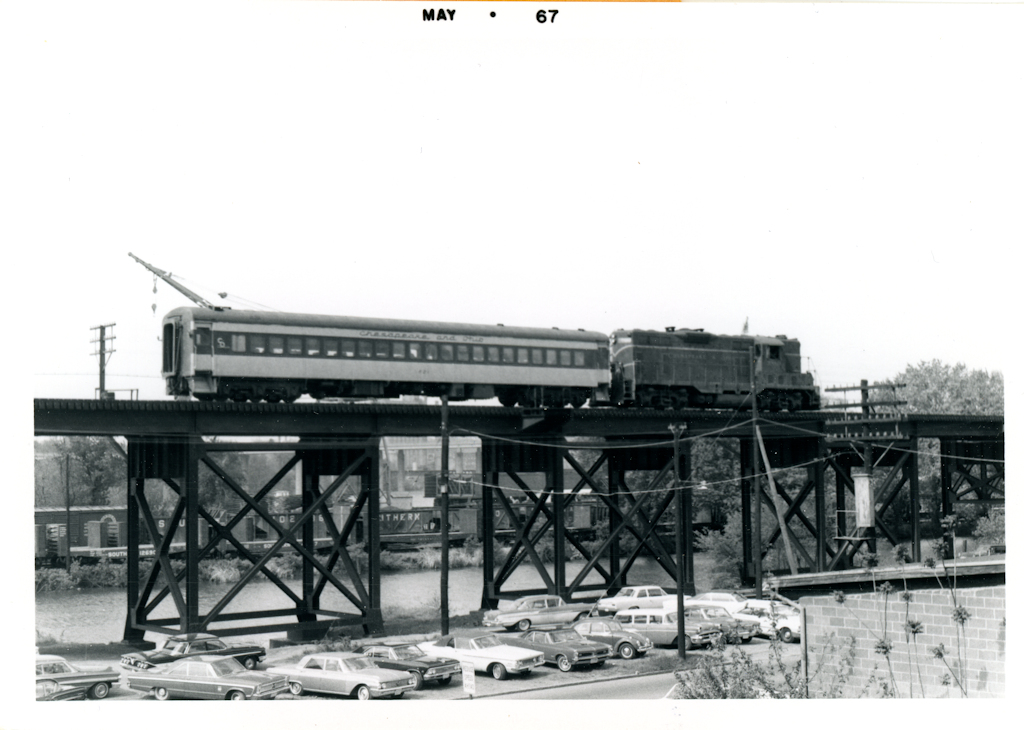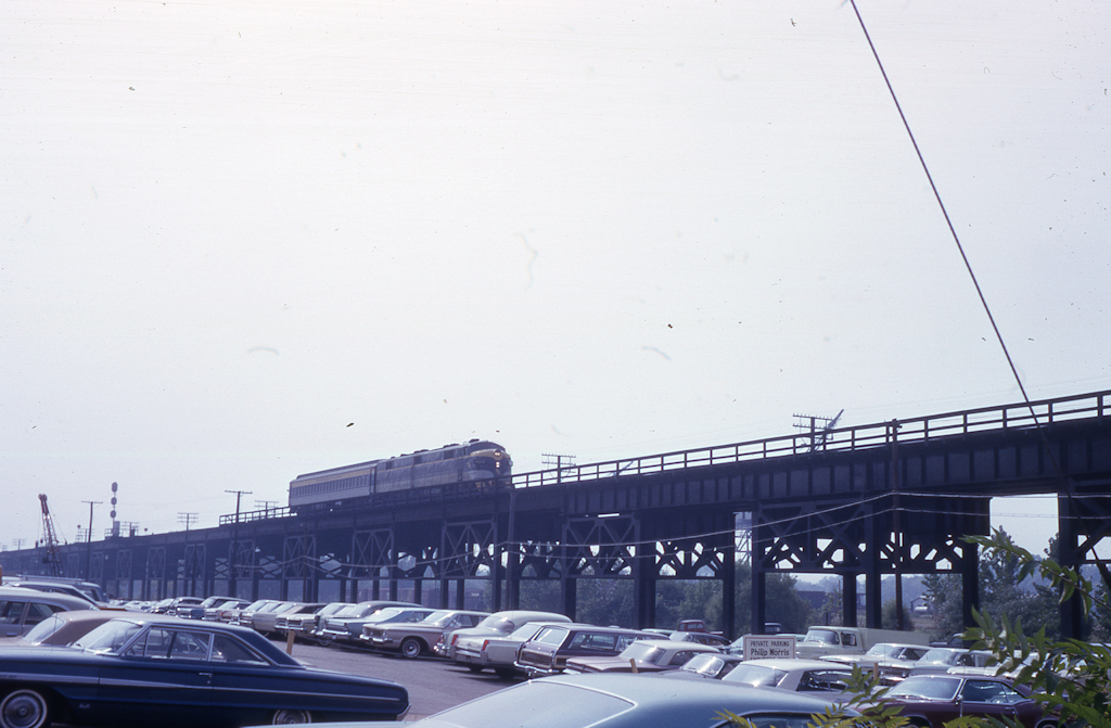September 6, 1966 and a C&O E8 leads a single coach toward Main Street Station. This photo was taken by the same unknown photographer as the Church Hill Tunnel photo above. (Photographer unknown. From a slide in the collection of Larry Z. Daily.)