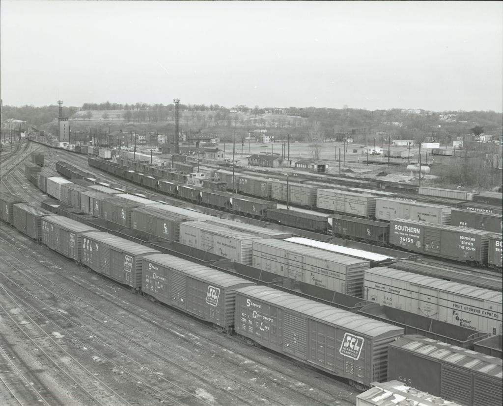 In the mid-1970’s, Fulton had 16 tracks on its east-bound side, with capacities ranging from 8 cars to 160 cars. The west-bound side had 10 tracks (the smallest held 40 cars, the largest, 160 cars). The caboose track was located between the east- and west-bound tracks. The C&O’s interchange with the Southern Railway, located on Park Siding, was reached from Fulton Yard over a long trestle over Gillins Creek.