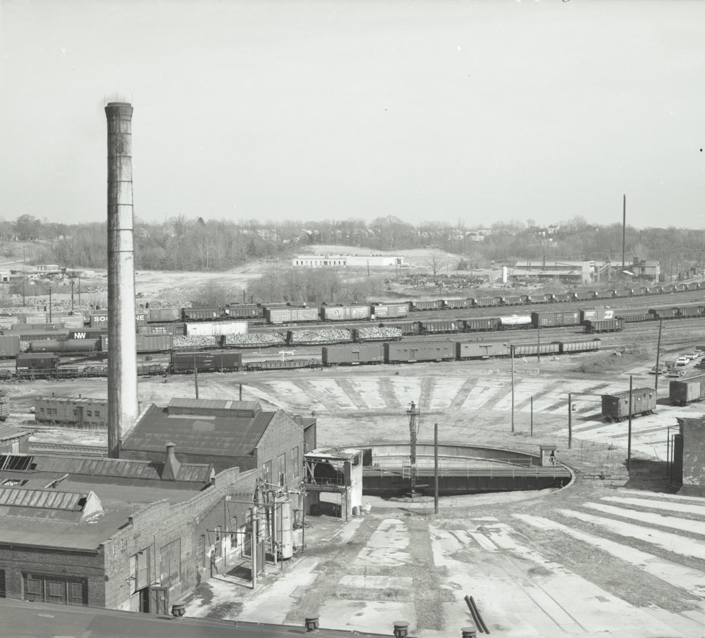 [NEW] This photo — taken from a fairly high vantage point — shows the Fulton Yard turntable on February 28, 1974. (Photographer unknown. From a negative in the collection of Larry Z. Daily)
