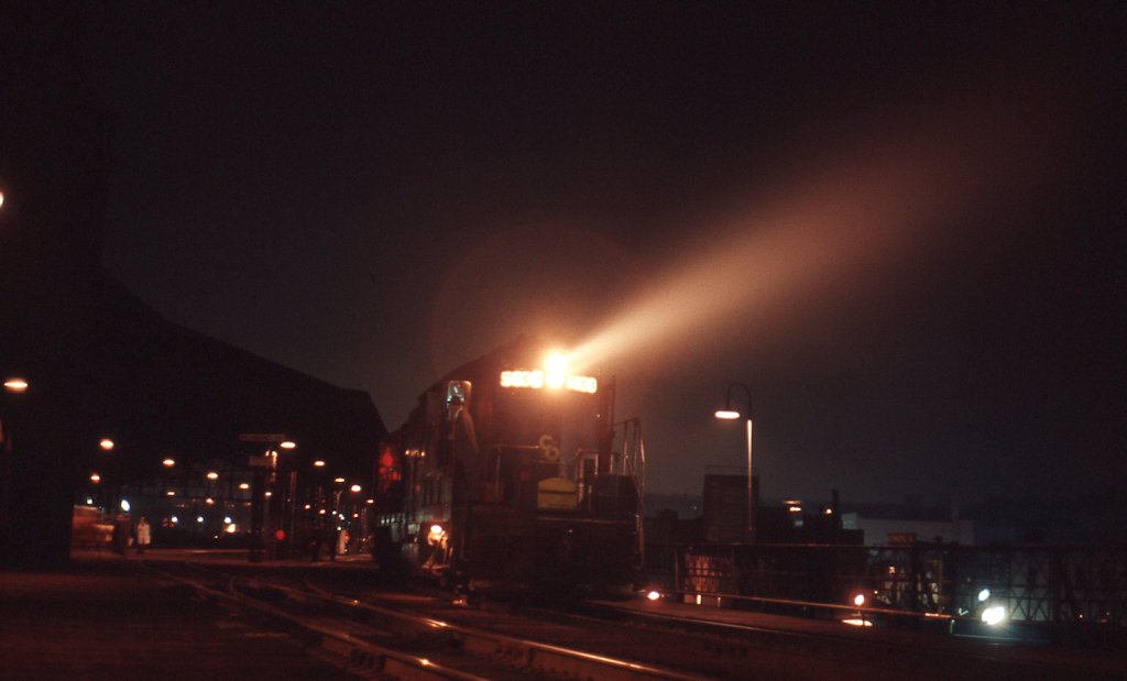 [NEW] It’s October 24, 1971 and one of the C&O’s ubiquitous GP’s is at the head of a freight train stopped at Main Street Station in this evocative night scene. It’s hard to read the numberboards, but I think the engine is in the 5800 series, making this a GP7. I love this shot. (Photographer unknown. From a slide in the collection of Larry Z. Daily)