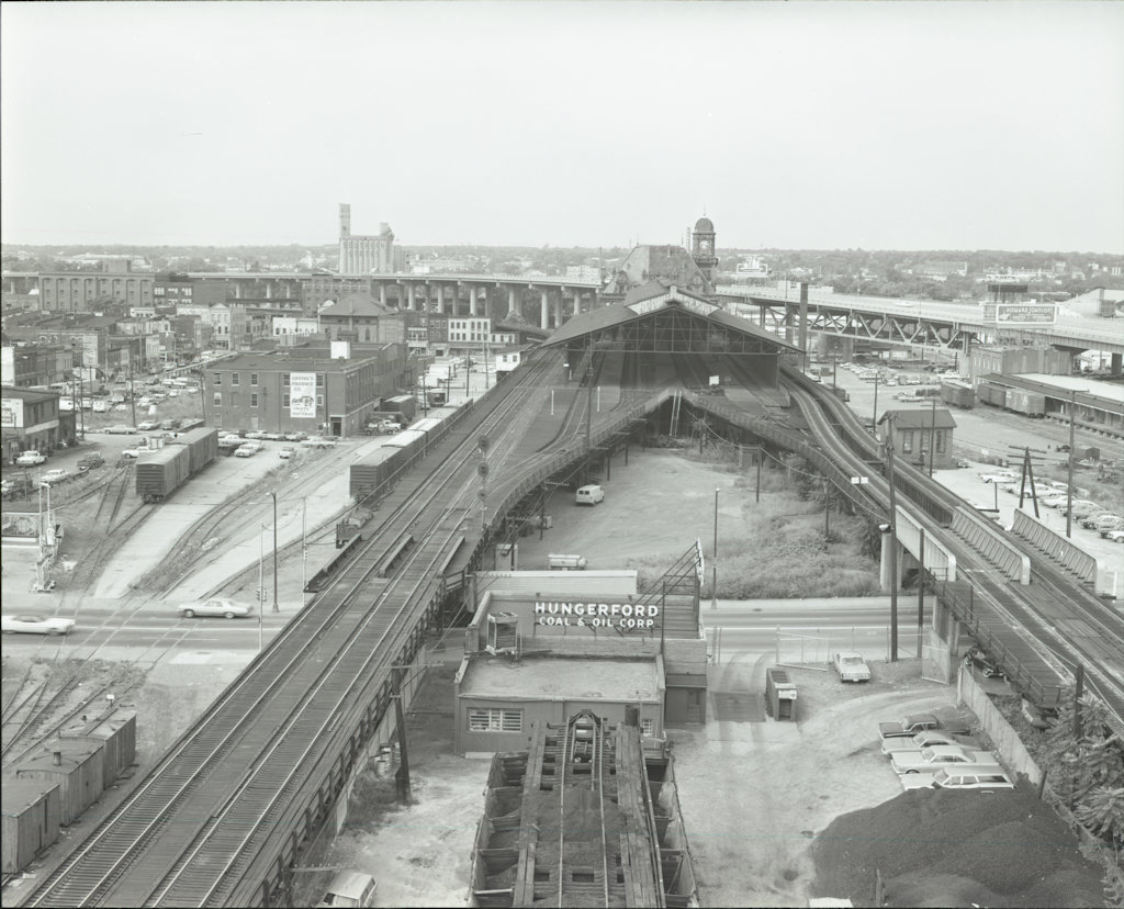 The train sheds at Main Street Station, January, 1973. (LaVerne Brummel photo, used with permission)