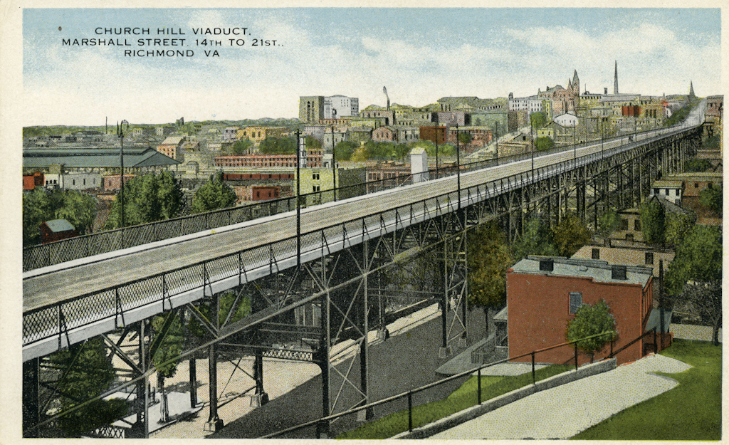 The Marshall Street Viaduct — also known as the Church Hill Viaduct — was buit by the Richmond and Henrico Railway to cross the Shockoe Valley. It opened on February 12, 1911, and served until June 26, 1970. For more information, see Richmond’s Lost Skyway: The Marshall Street Viaduct and Why Richmond, Why?!?: The Richmond Bridge to Nowhere.