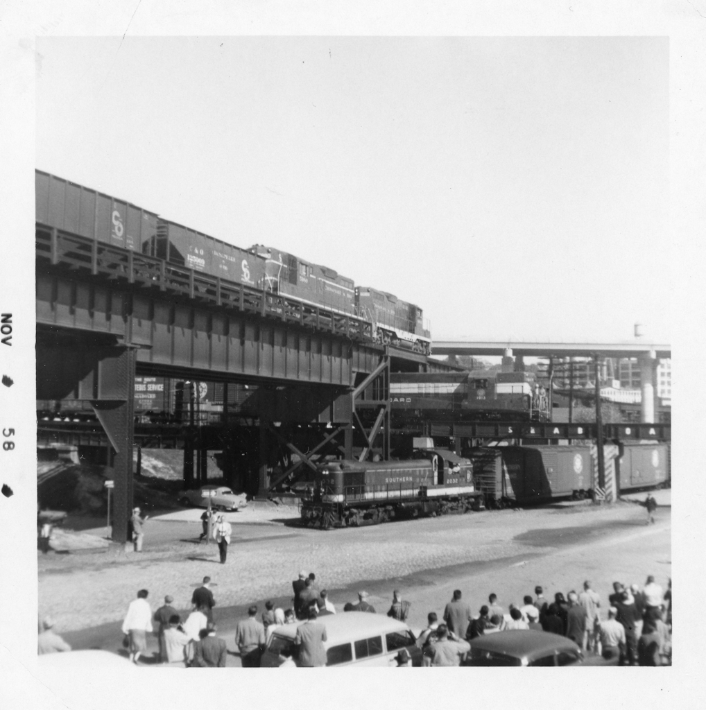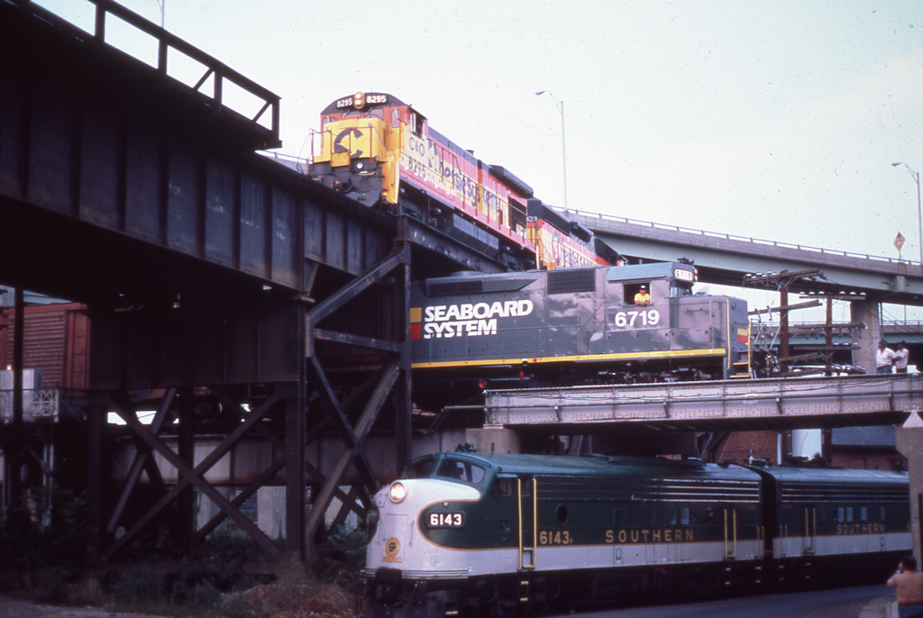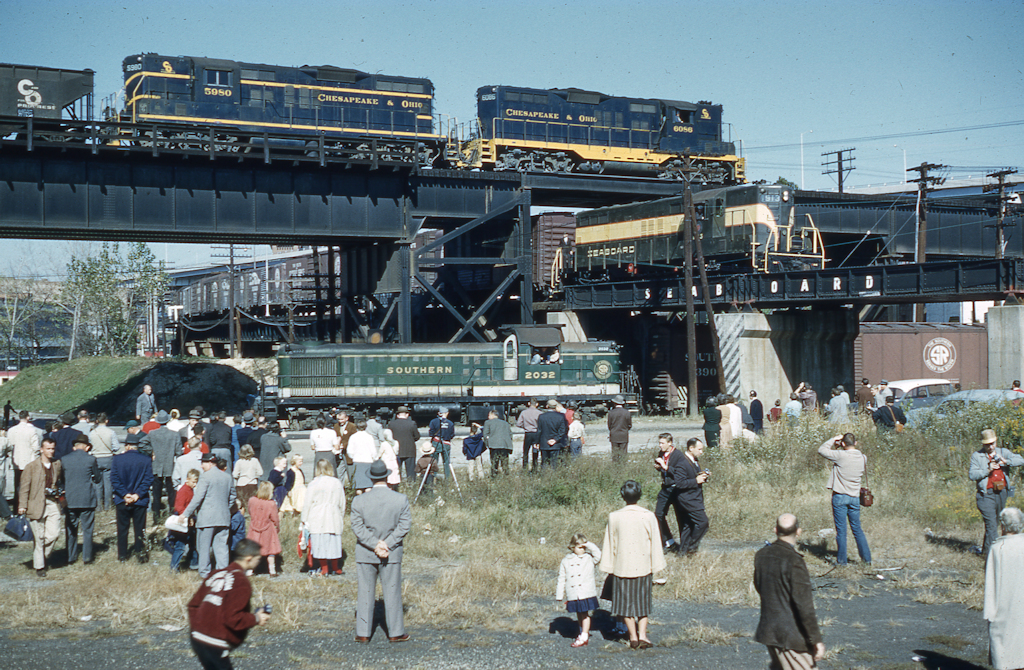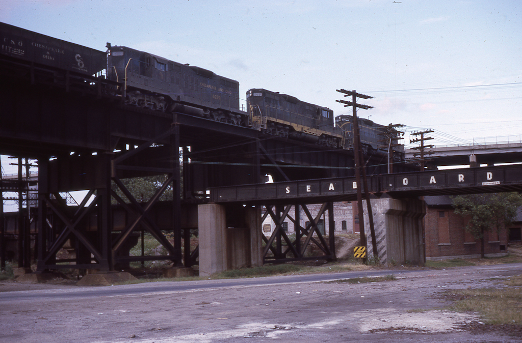 Perhaps one of the most famous places in Richmond (at least among railfans) is the Triple Crossing. At that point, near the banks of the James River, three different railroads crossed over one another. The Southern was at ground level, the Seaboard Airline crossed on one bridge, and the C&O, on its James River Viaduct, was on top. Over the years, the railroads often staged photo opps at this location.