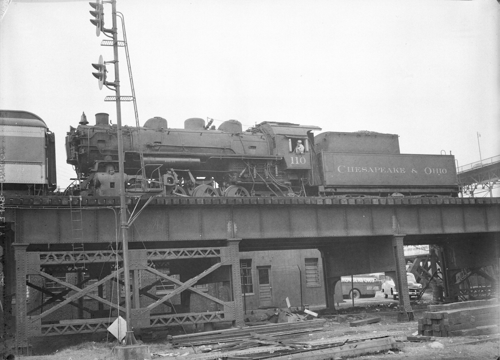 C&O L-2 4-6-4 number 306 is on the head end of a passenger train on February 25, 1953. The notes on the slide said this was the Triple Crossing, but the C&O was on the top level there. According to Marc Dickinson, this photo was taken just north of Main Street Station. The bridge in the background is the Marshall Street Viaduct (see below). (Photographer unknown. From a slide in the collection of Larry Z. Daily.)